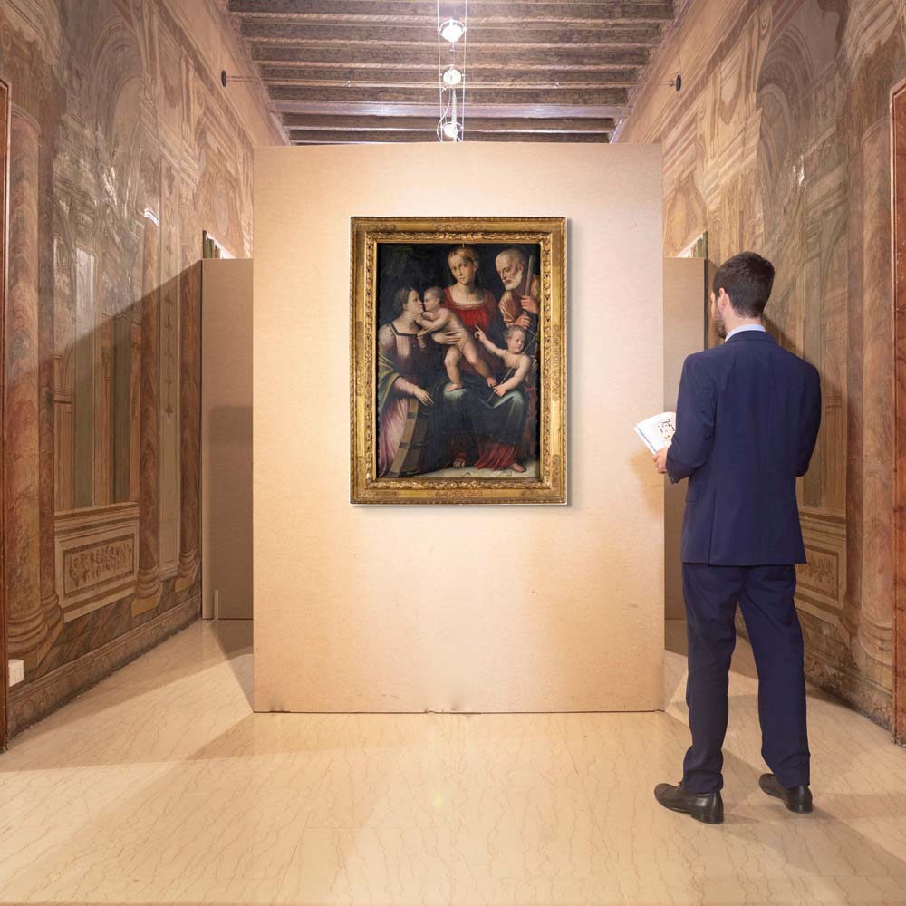 Sacra Famiglia con Santa Caterina d'Alessandria e San Giovannino olio su tavola cm 102,5x71,5 - con cornice cm 126x96 Questa intensa scena sacra raffigura il Matrimonio mistico di Santa Caterina d'Alessandria, soggetto devozionale molto diffuso tra la fine del Quattrocento e l'inizio del Cinquecento. L'opera si distingue per la delicatezza dei gesti e la disposizione equilibrata dei personaggi. A sinistra, inginocchiata in atteggiamento devoto, Santa Caterina sostiene la palma del martirio con la mano poggiata sulla ruota del suo supplizio. Al centro della scena siede la Vergine Maria, serena e composta, che sorregge in grembo Gesù Bambino, il quale prende il volto della santa tra le mani e si inclina per baciarla, un atto che sostituisce il più comune simbolo dell'anello nuziale e accentua la dimensione mistica dell'unione spirituale tra la santa e Cristo.