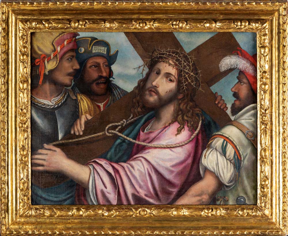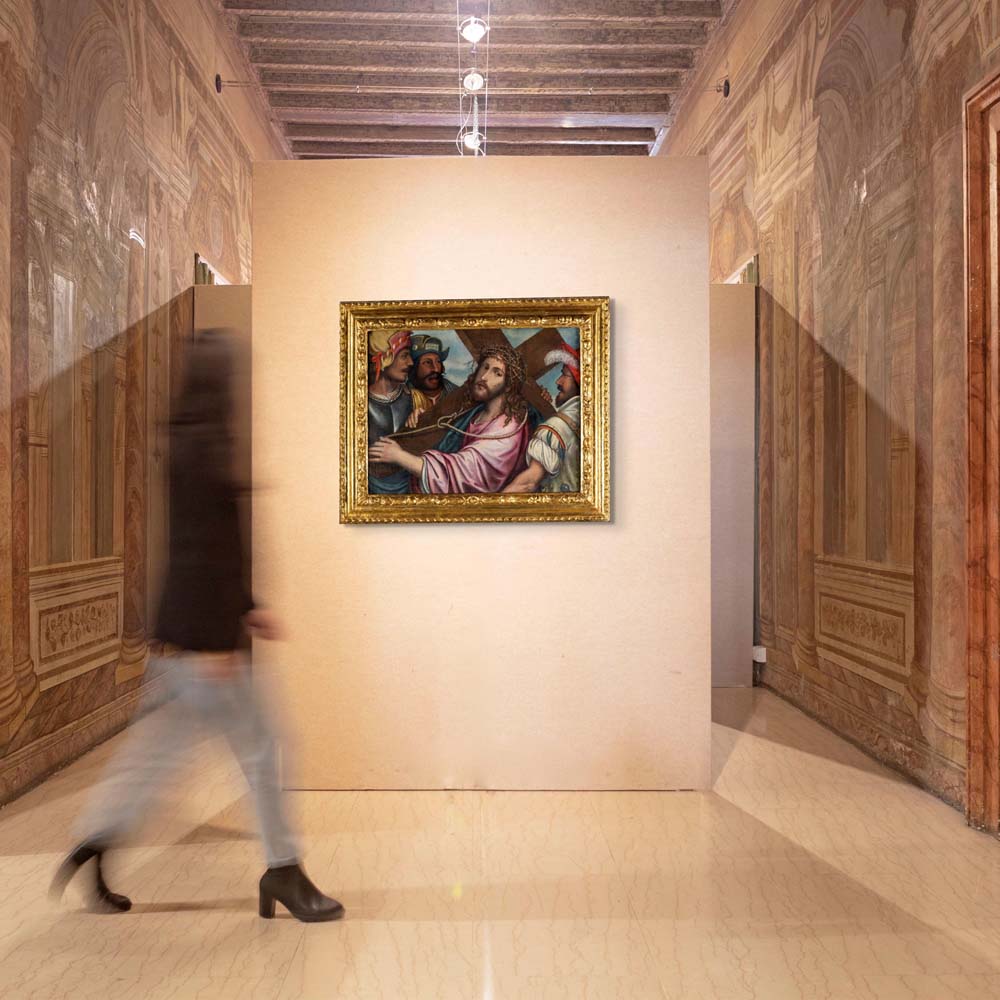 Cristo portacroce olio su tela cm 66x84 - con cornice cm 87x106,5 Registrata nella Fototeca Zeri con scheda n. 39114, l’opera, già in collezione Sterbini, raffigura Cristo nell’atto di portare la croce, in composizione rappresentativa del repertorio veneto di Nicolò Frangipane (1555‑1600). Artista attivo tra Venezia e Udine, Frangipane è noto per la sua produzione religiosa e per la capacità di unire modelli tardo-cinquecenteschi veneziani a una resa attenta dei dettagli anatomici e della luce. La scena mette in evidenza la sensibilità luministica e la cura del dettaglio anatomico, richiamando modelli veneziani della sua epoca. già collezione G. Sterbini; collezione Lupi; collezione privata, Roma Pubblicato in Fondazione Zeri n. 39114