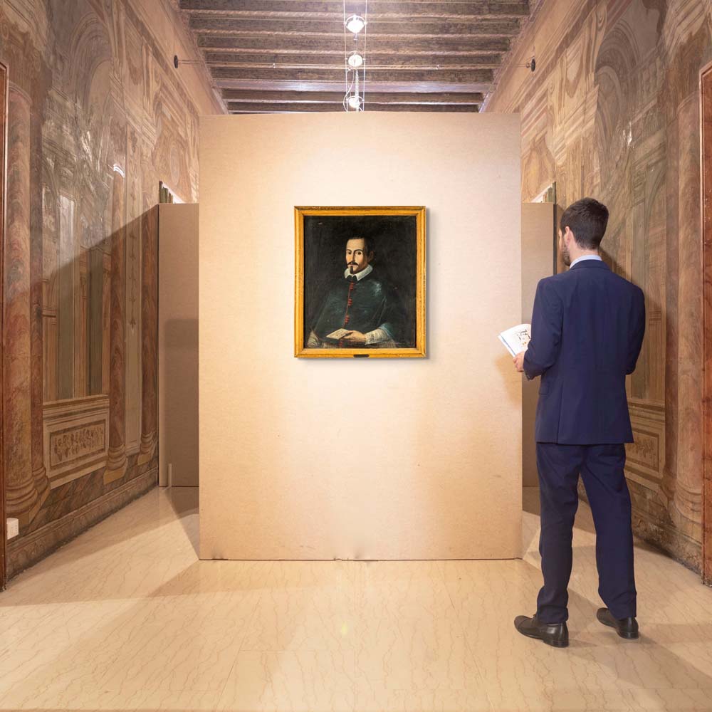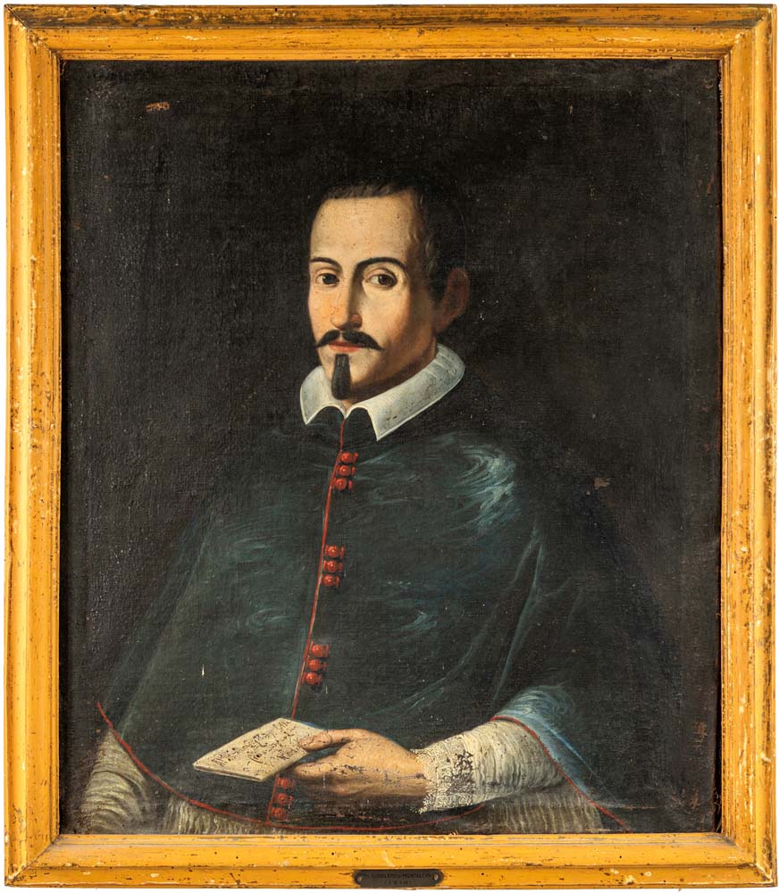Ritratto di Girolamo Piccolomini vescovo di Montalcino e Pienza olio su tela cm 75x63 - con cornice cm 85x74 Iscrizione: illeggibile, nella lettera che sostiene in mano il personaggio