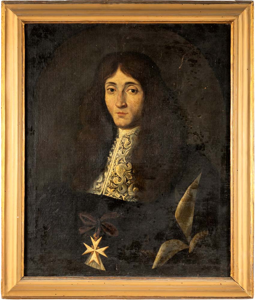 Ritratto di Francesco Augusto Piccolomini come Cavaliere di Malta olio su tela cm 75,5x61 - con cornice cm 87,5x73,5 Iscrizioni: CAV. F. AUGUSTO / DI GIOVAN BATT.A PICCOLOMINI / D'ANNI 25, in un'etichetta sul retro