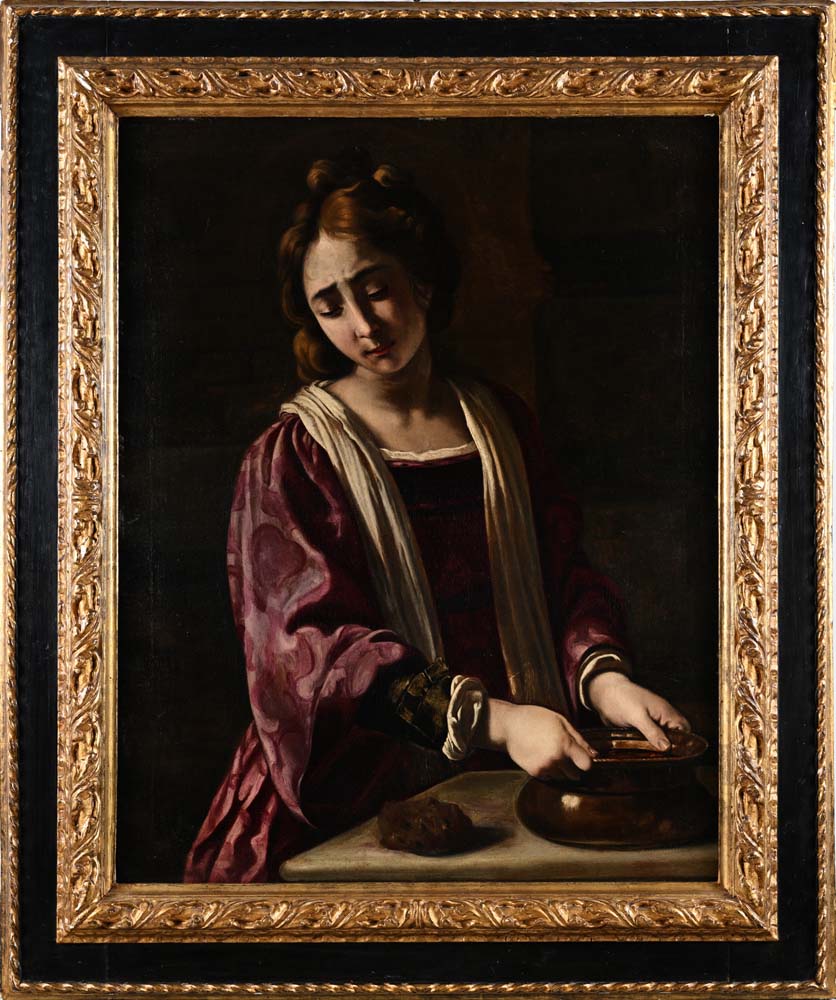 Maria Maddalena Olio su tela cm 99x77 - con cornice cm 127,5x106,5 L’intensa figura della Maddalena, colta in un momento di meditazione e silenzio, è resa con un naturalismo misurato e profondamente emotivo. La luce radente modella il volto e le mani con raffinato chiaroscuro, facendole emergere dal fondo scuro in perfetta sintonia con la sensibilità caravaggesca diffusa a Napoli nella prima metà del Seicento.