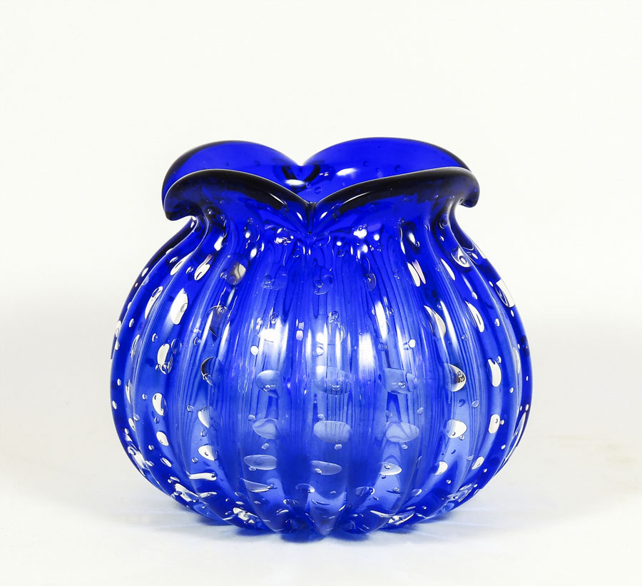 VASO IN VETRO SOFFIATO BLU Murano, Barovier e Toso corpo baccellato con...