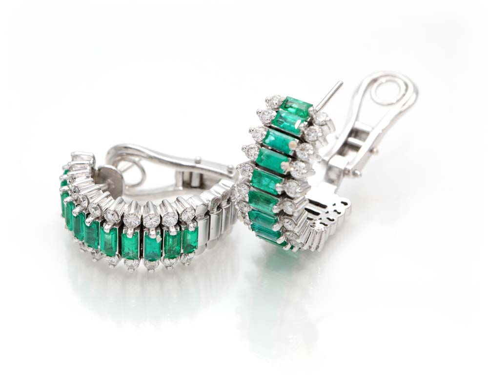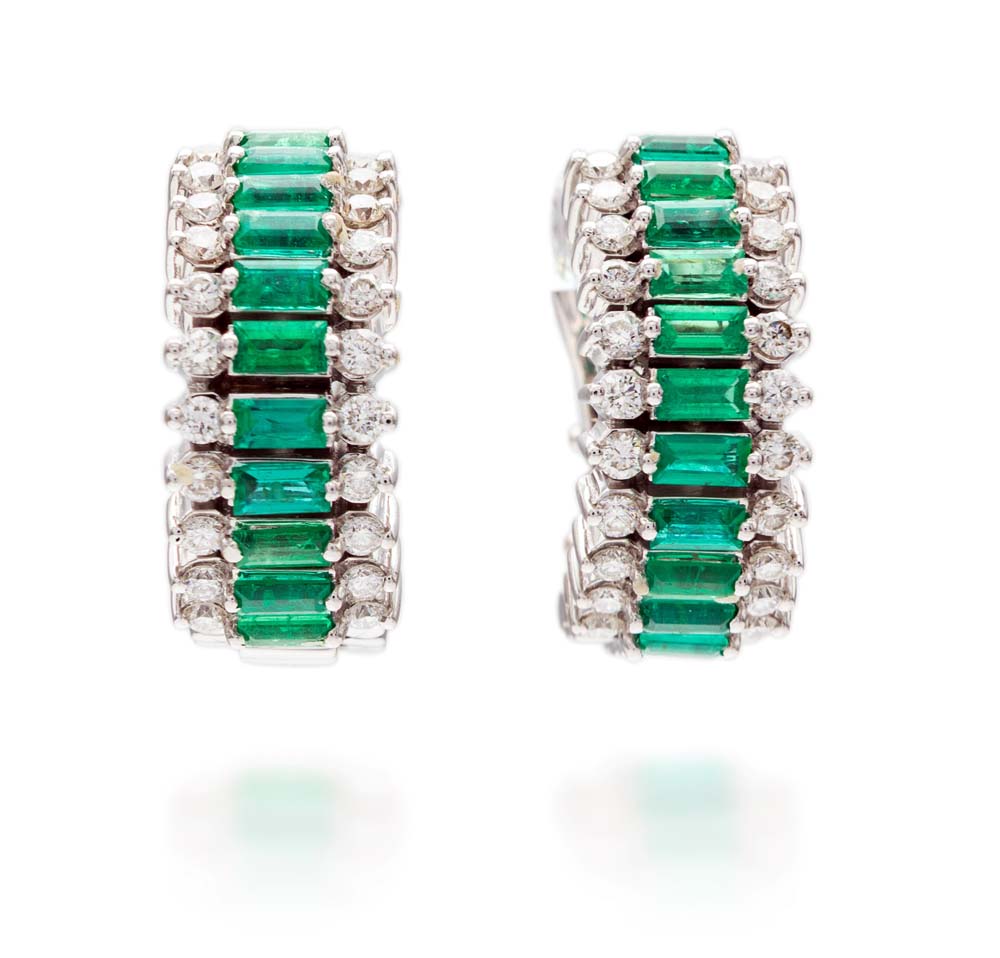 D&D Gioielli - Coppia di orecchini in oro, brillanti e smeraldi Oro bianco 750/000. Peso complessivo gr 21,30 cm 2,5x1,5