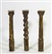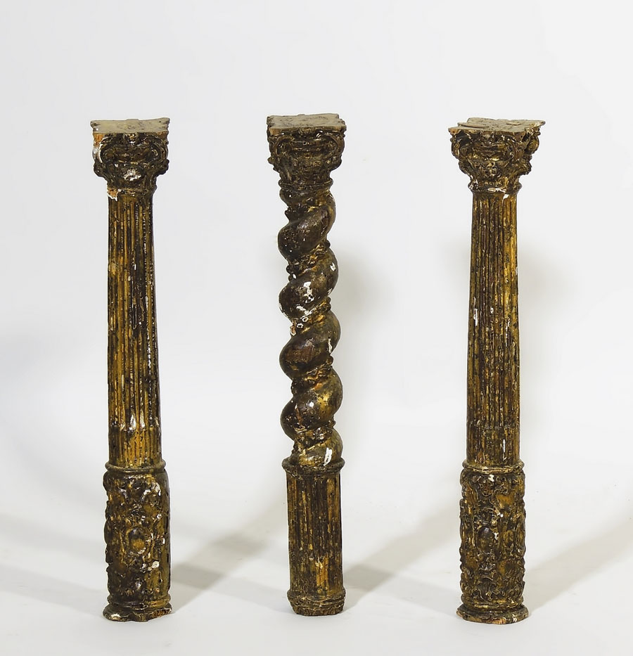 COPPIA DI ANTICHE COLONNINE IN LEGNO INTAGLIATO E DORATO fusto scanalato con capitelli ionico-corinzi ed un'altra tortile, difetti h cm 39 (3) A PAIR OF GILTWOOD COLUMNS AND ONE SIMILAR