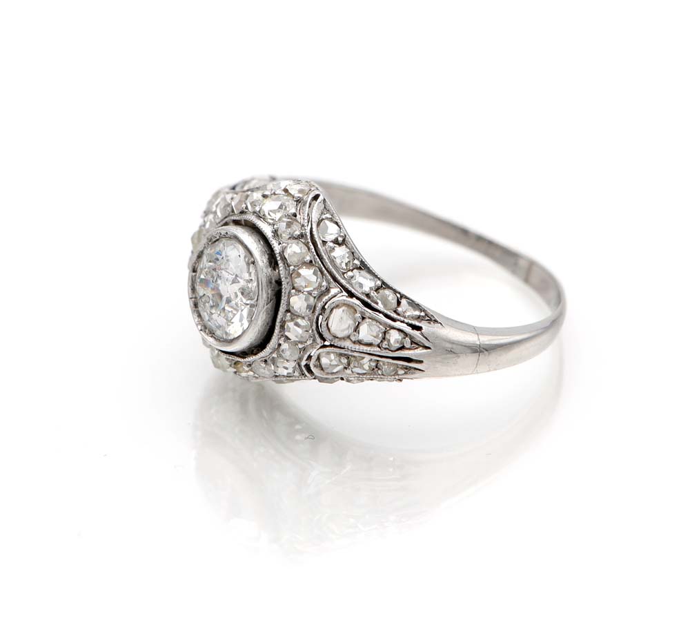 Lotto 53 | Anello decò in oro, diamante solitario centrale e diamanti Oro bianco...