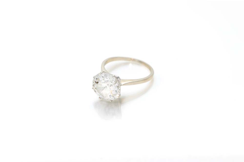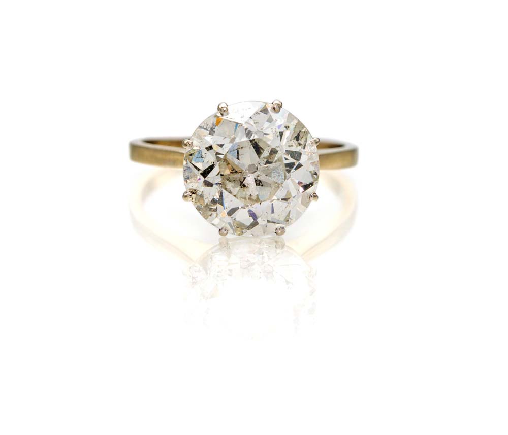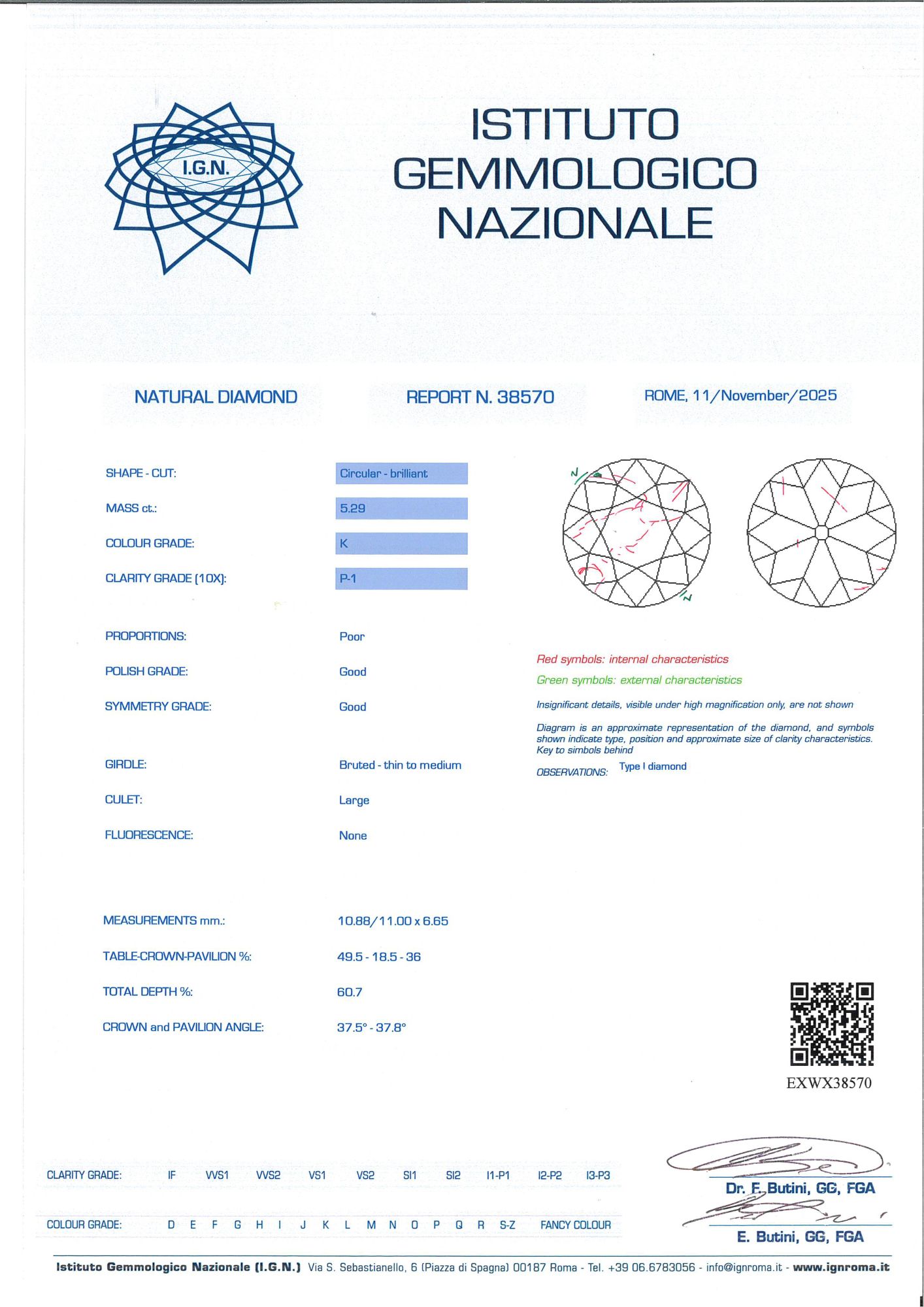 Anello in oro e brillante solitario Oro bianco 750/000. Diamante solitario centrale in taglio rotondo brillante ct. 5,29, colore K, P1. Corredato di certificazione gemmologica IGN n°38570 del 11/11/2025. Peso complessivo gr. 3,70. Misura 12