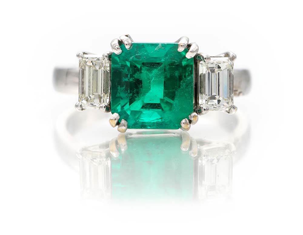 Anello con smeraldo colombiano in taglio smeraldo e baguettes. Oro bianco 750/000. Smeraldo Colombia ct 2,22 in taglio a gradini di forma ottagonale. Corredato di certificazione gemmologica IGN n° 0390 del 07 maggio 2003. Misura 13