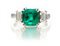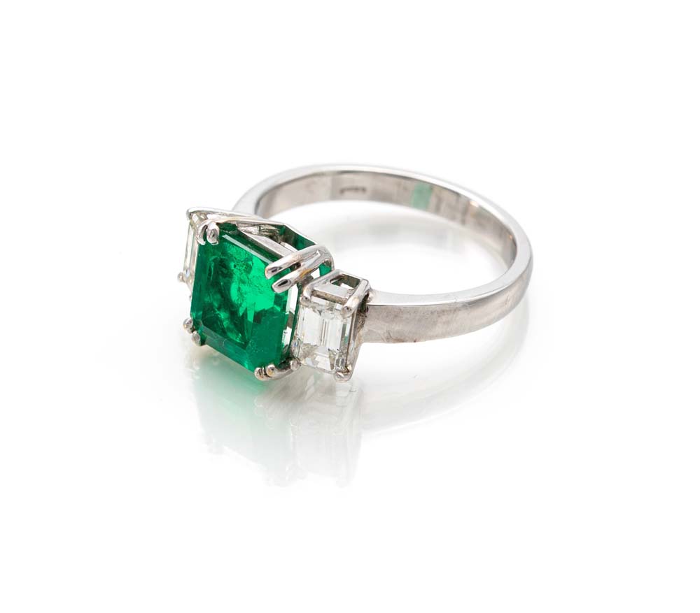 Anello con smeraldo colombiano in taglio smeraldo e baguettes. Oro bianco...