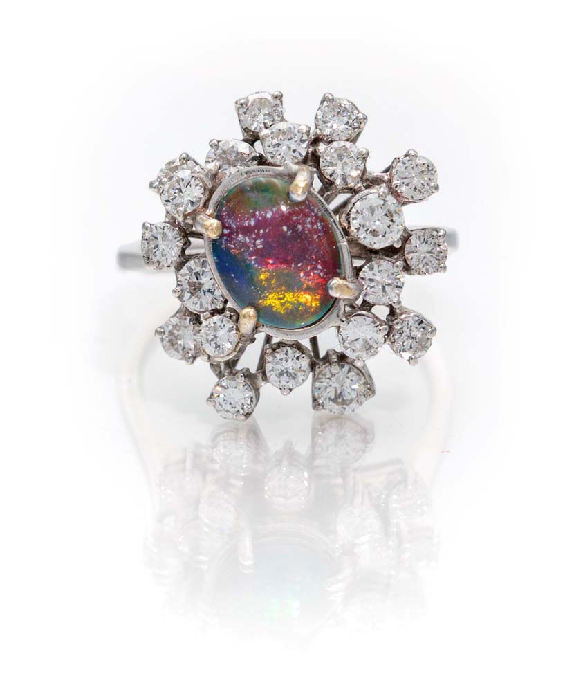 Anello a fiore in oro, brillanti ed opale Oro bianco 750/000.Diamanti in taglio rotondo brillante ct. 1,30 ca. Peso complessivo gr. Misura 16