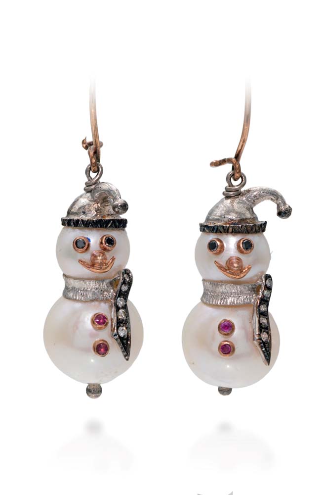 Coppia di orecchini "pupazzo di neve" in oro, perle , rubini e diamanti Oro a...