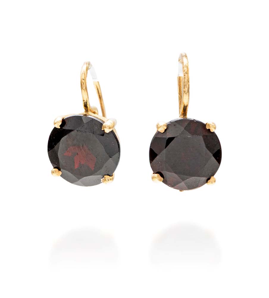 Coppia di orecchini a monachina in oro e granati Oro giallo 585/000. Peso complessivo gr. 4 cm 2