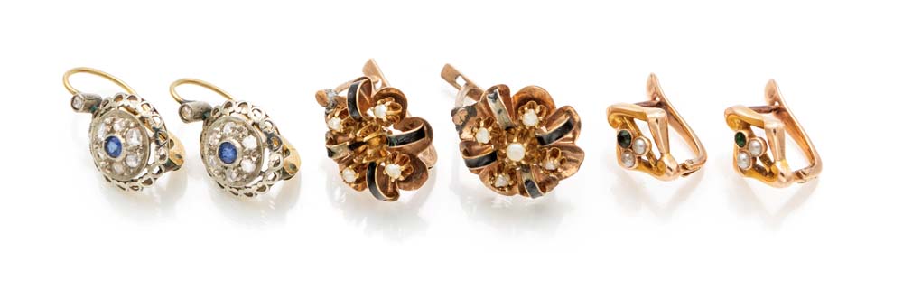 Gruppo di 3 coppie di orecchini in oro, diamanti e pietre Oro giallo 750/000 e basso titolo. Peso complessivo gr. 7,10