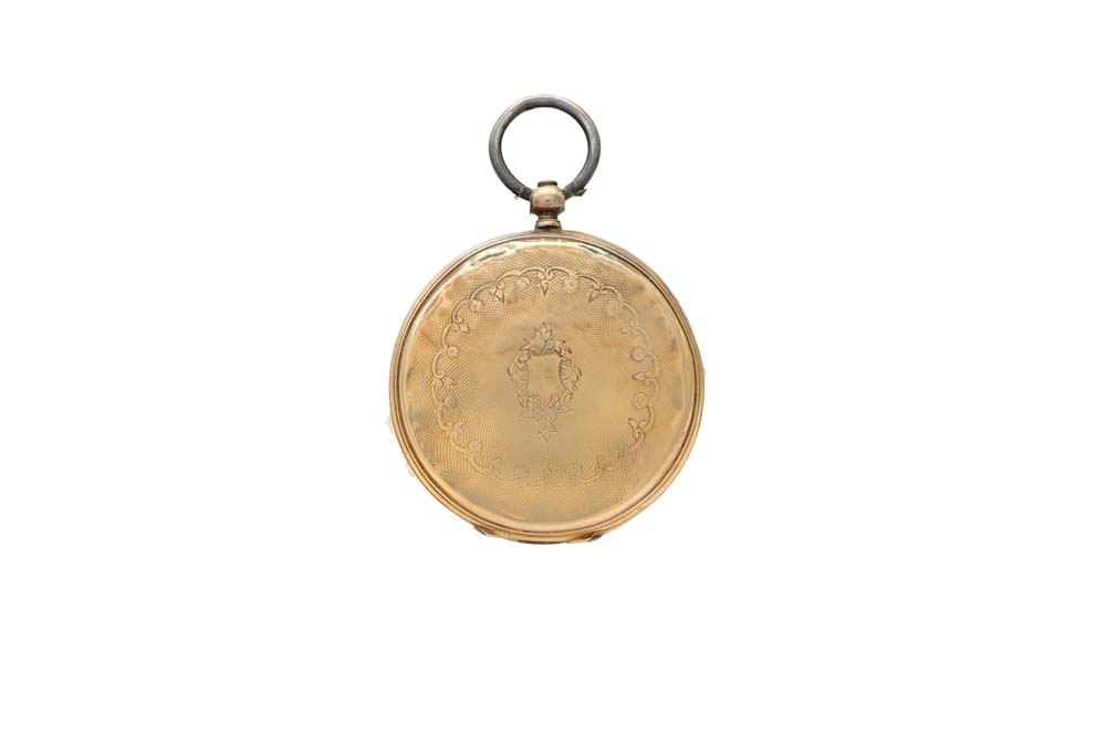 Orologio da taschino in oro. Oro giallo. Cassa decorata a guillochè e incisioni. Quadrante in smalto bianco, numeri romani. Movimento con carica a chiavetta, scappamento a cilindro.