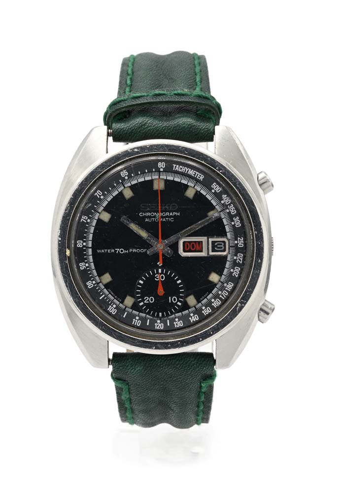 Seiko cronografo automatico in acciaio Acciaio. Ref. n° 6139 "Bruce Lee". Cassa firmata n° 050799, tonneau in acciaio, fondello a vite, pulsanti tondi, quadrante firmato, nero, indici luminescenti, pista della minuteria bianca, quadrantino del sommatore dei 30 minuti, scala tachimetrica esterna su rehaut, finestrella per il giorno del mese e della settimana. Movimento firmato, calibro automatico n° 6139A, bilanciere monometallico, spirale piana.  Anni '70 Diametro mm 39