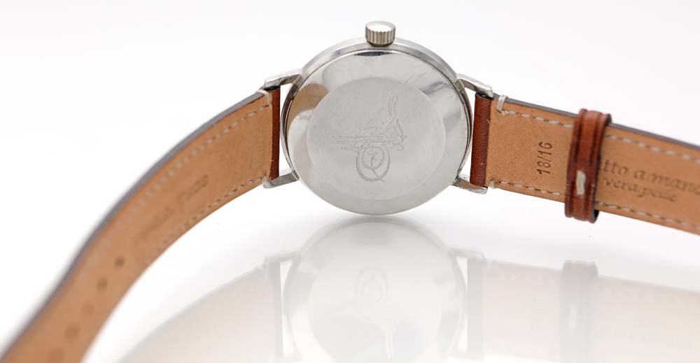International Watch Cie orologio da polso in acciaio Acciaio. Ref. 818 AD. Personalizzazione del Re Mohammed Zahir Shah. Cassa in acciaio, n° 2084215, fondello a scatto, personalizzato con incisione della firma del Re. Quadrante argentato, indici applicati, secondi al centro, data. Movimento automatico, calibro C8541B, n° 2030145.