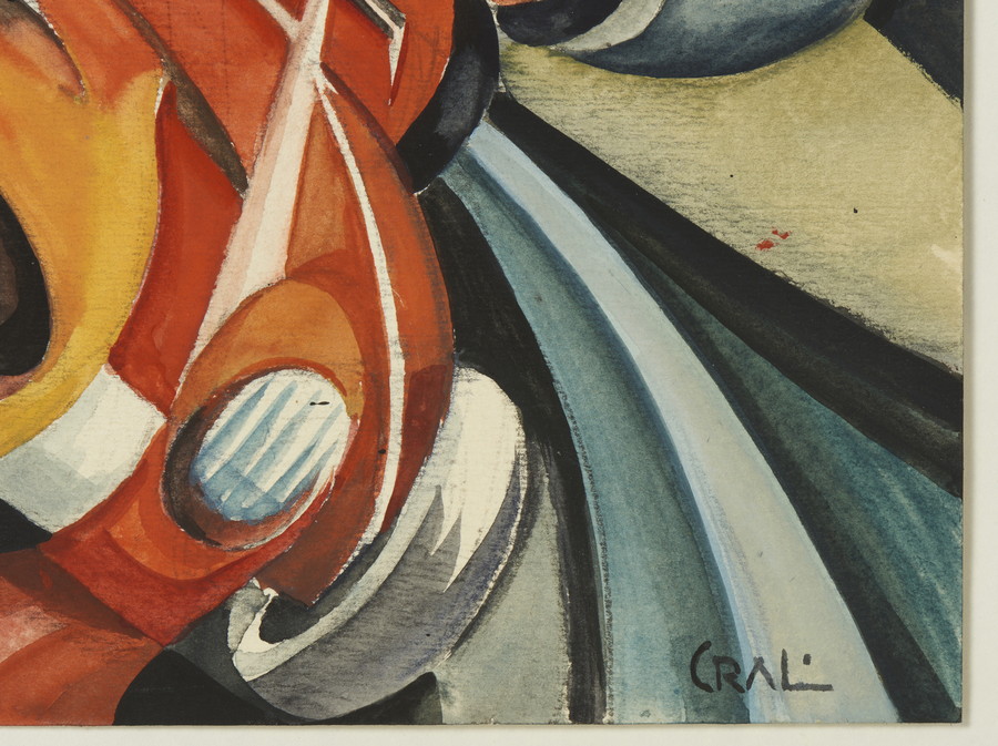 Prima ancora di essere affascinato dagli aerei, già alcune operette realizzate nel 1925/26, quando aveva solo 15 o 16 anni, mostravano la sua fascinazione per la velocità terrestre, specie per le auto da corsa. E questa splendida composizione, ruotata di 45 gradi a destra (per enfatizzare l’effetto dinamico) ne è un perfetto esempio. E anche un importante esempio che ci fa comprendere come Crali sia arrivato, nel 1930, a dipingere quel capolavoro che è “Le forze della curva”, e che è l’apoteosi della forza meccanica e centrifuga di un automobile lanciata in corsa.