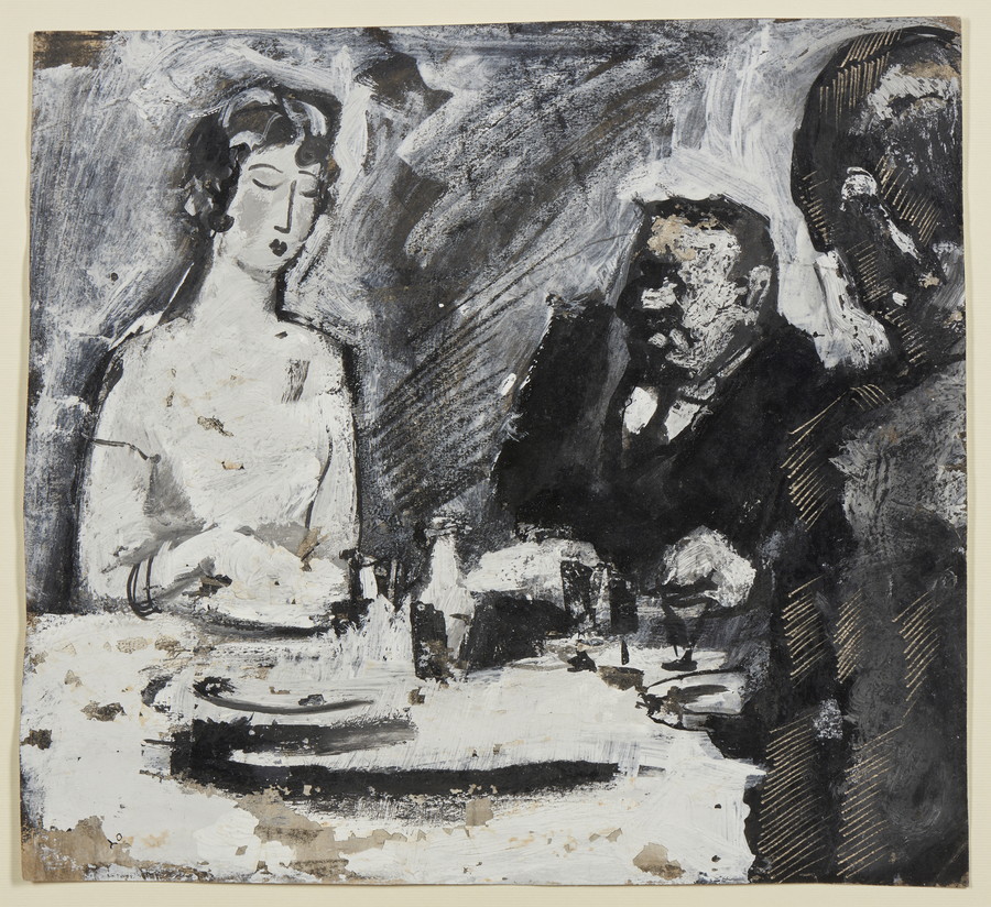 SIRONI MARIO (1885 - 1961) STUDIO DI UN'ILLUSTRAZIONE NON PUBBLICATA PER UNA NOVELLA DELLA RIVISTA ILLUSTRATA DEL POPOLO D'ITALIA, (1940 ca). Tempera, china e matita grassa su carta. Cm 26,60 x 24,50. L'opera è accompagnata da certificato di archiviazione a cura dell'Associazione per il patrocino e la promozione della figura e dell'opera di Mario Sironi, Milano. Cornice presente