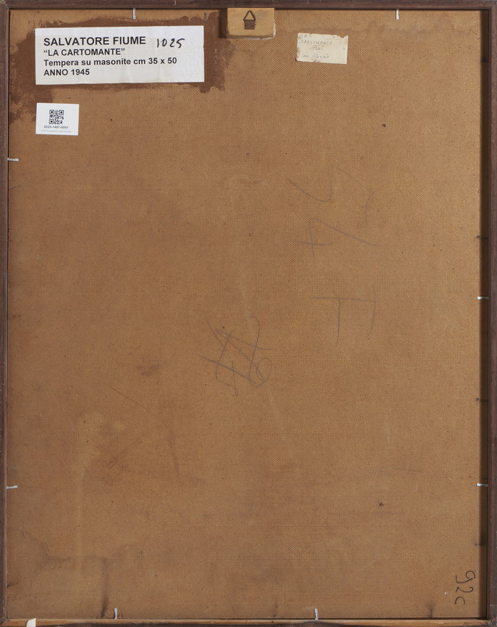La cartomante fa parte di un prezioso gruppo di disegni su carta, colorati a tempera, nei quali si percepisce chiaramente l'ispirazione metafisica di Alberto Savinio e Giorgio De Chirico, due grandi maestri della pittura italiana che Fiume ammirava.