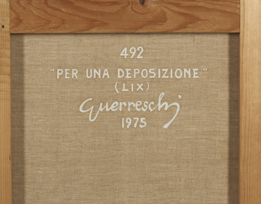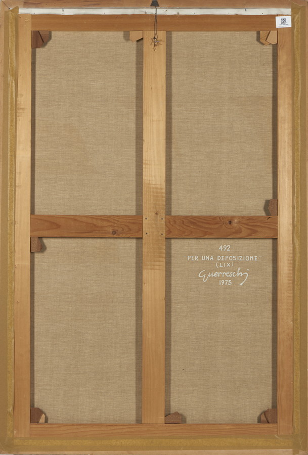 GUERRESCHI GIUSEPPE (1929 - 1985) PER UNA DEPOSIZIONE (LIX). 1975. Olio su tela. Cm 100,00 x 150,50. sul retro: firma, data e titolo