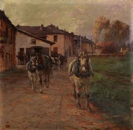 RODA LEONARDO Racconigi 1968-1933 Torino Paesaggio con cavalli 1914 Olio su...