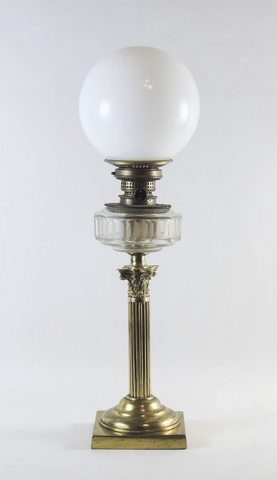 LUME A PETROLIO IN OTTONE XIX secolo sostegno realizzato come una colonna scanalata con capitello corinzio, base quadrata, bobeche non pertinente h cm 48 BRASS OIL LAMP, 19TH CENTURY