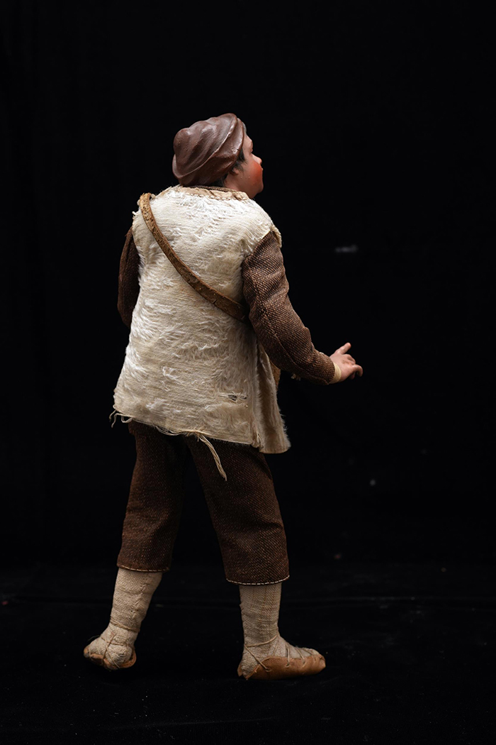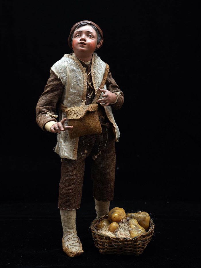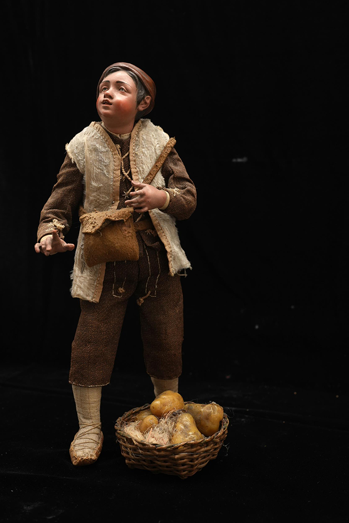 Ragazzo rustico attr. L. Mosca con coppola in terracotta h cm 23 accessori: cestino con mele cotogne, tracolla in pelle Napoli XVIII - XIX secolo