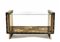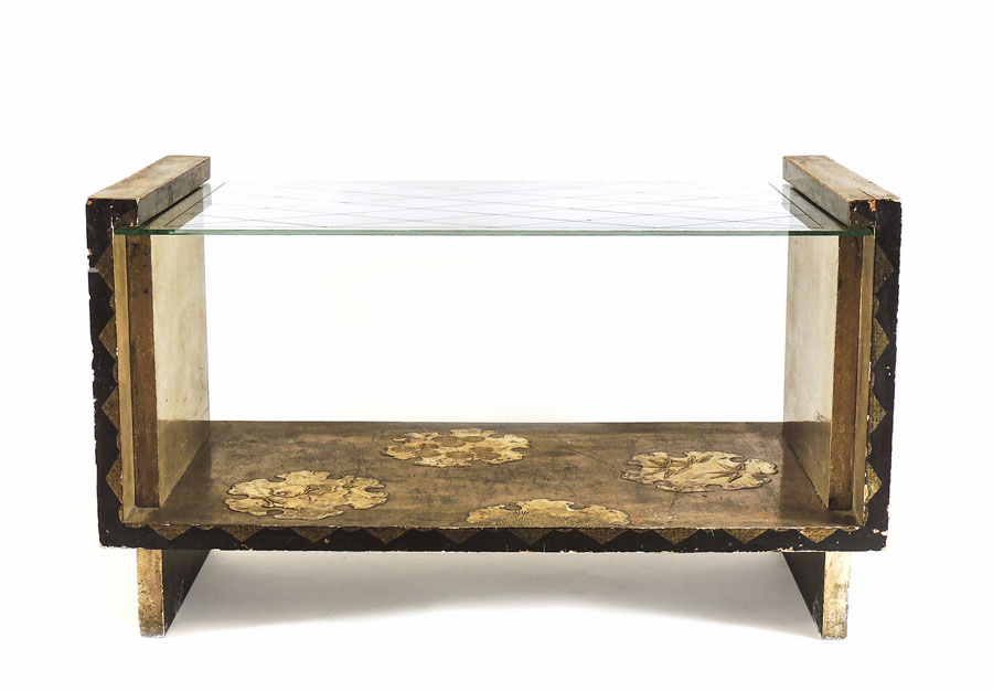 TAVOLINO BASSO IN LEGNO LACCATO E IN PARTE DORATO inizio del XX secolo decorato a chinoiserie con motivi di gusto liberty entro riserve sagomate, piano in cristallo molato con motivo a losanghe, h cm 50x84x44 LACQUERED AND PARTIALLY GILDED TABLE, EARLY 20TH CENTURY