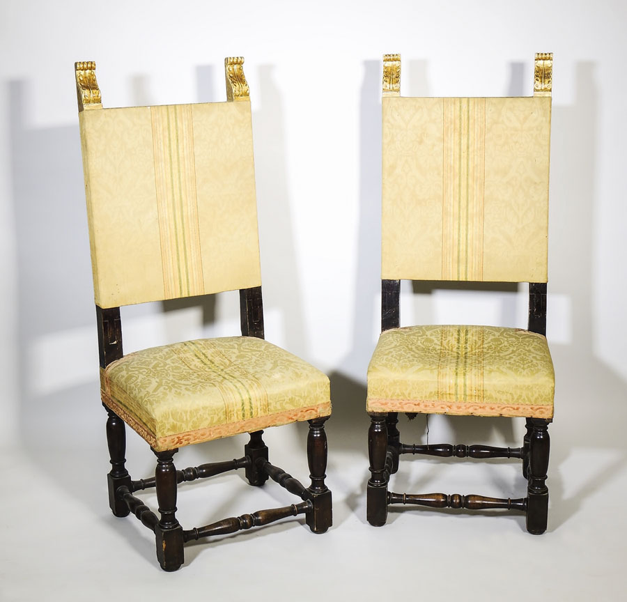 COPPIA DI SEDIE IN NOCE fine del XIX/inizio del XX secolo schienali desinenti a fiamma dorata, gambe tornite riunite da traverse, rivestite in tessuto verde salvia, lievi difetti PAIR OF WALNUT CHAIRS, LATE 19TH/EARLY 20TH CENTURY