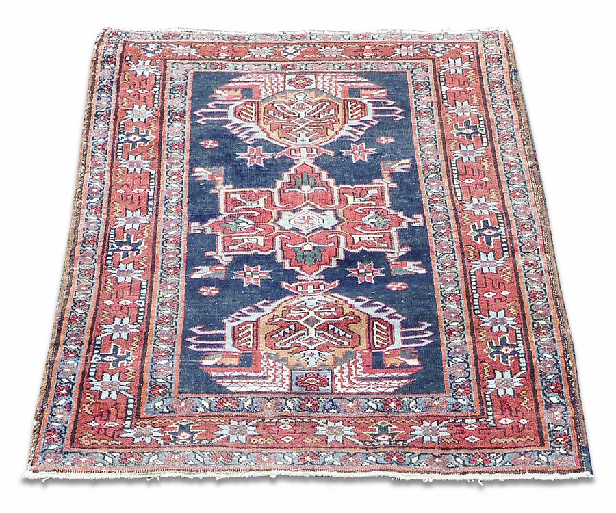 PICCOLO TAPPETO PERSIANO HERIZ 1920 circa fondo blu notte, campo con motivi floreali stilizzati e disegni geometrrici nei toni del rosso, beige e azzurro cm 140x87 SMALL PERSIAN HERIZ CARPET