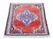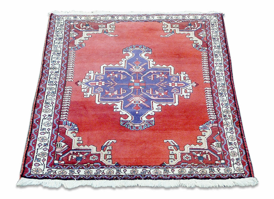 TAPPETO PERSIANO D'EPOCA fondo rosso, campo con medaglione centrale e disegni geometrici nei toni del blu, avorio e beige cm 140x107 OLD PERSIAN CARPET