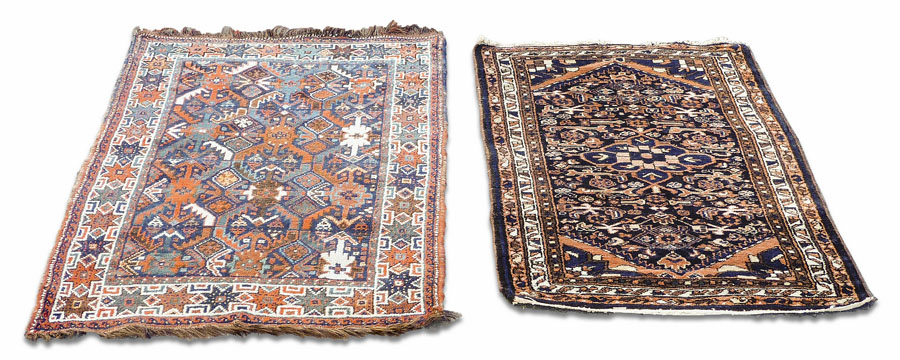 DUE PICCOLI TAPPETI PERSIANI D'EPOCA fondo blu, campo con motivi geometrici nei toni del rosso, avorio e azzurro cm 118x77, cm 130x84 TWO SMALL PERSIAN CARPETS