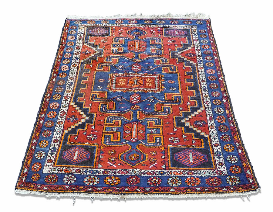 TAPPETO CAUCASICO fondo rosso, campo con motivi geometrici nei toni del blu, arancio e avorio cm 188x126 CAUCASIAN CARPET