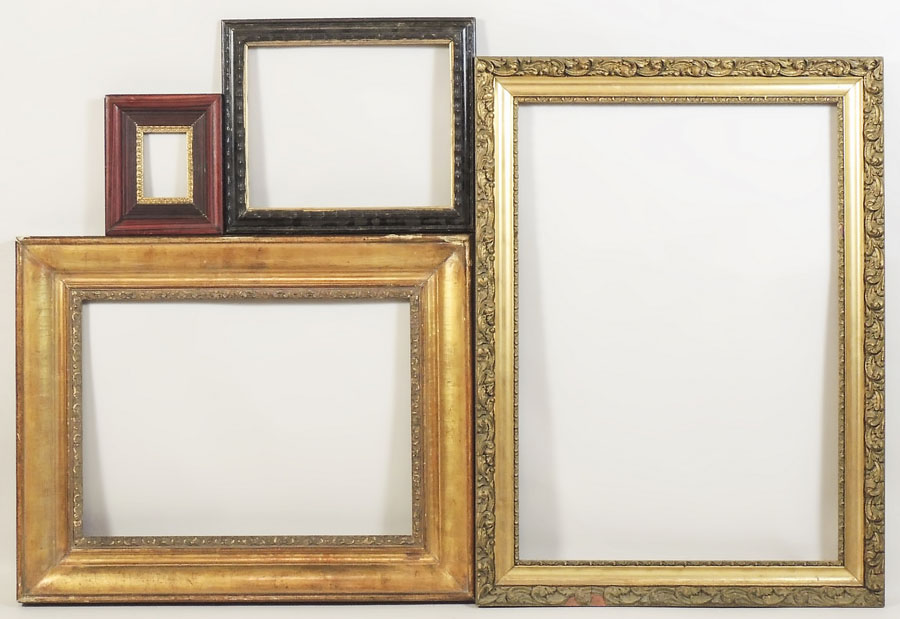 QUATTRO CORNICI tra cui una piccola in legno ebanizzato ed una in legno dorato decorata con volute e girali FRAME LOT