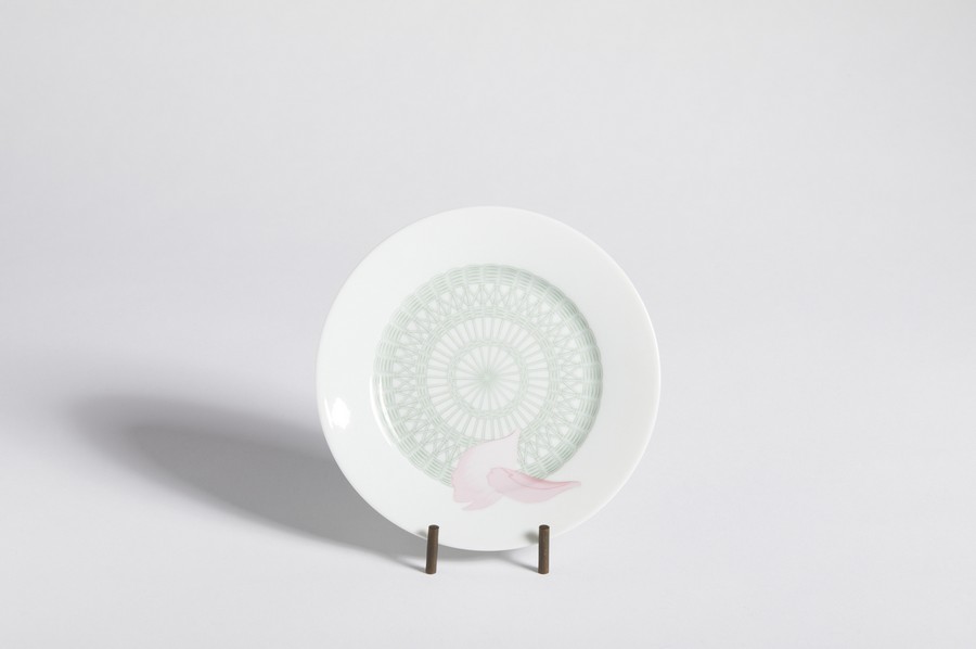 HERMES Piattino Les Piovoines. Porcellana Limoges. Cm 16,00. Piatto Hermes in porcellana con decoro centrale nei toni del verde e rosa pastello, al retro marchio Hermes.