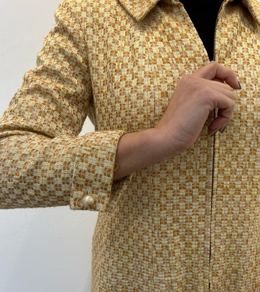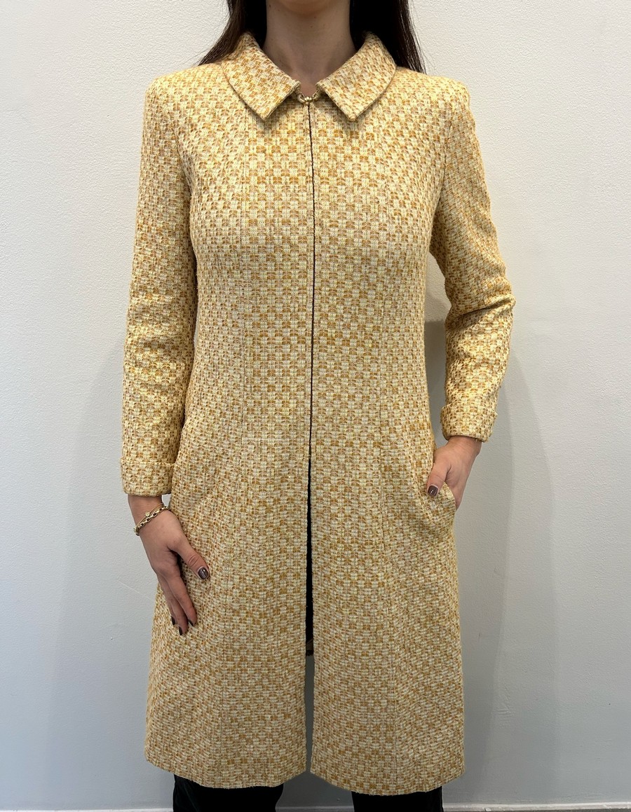 CHANEL Cappottino. Cotone, seta, viscosa. . Spolverino Chanel con chiusura a zip in tweed. Dettaglio di perle con marchio Chanel ai polsi. Taglia 40IT.