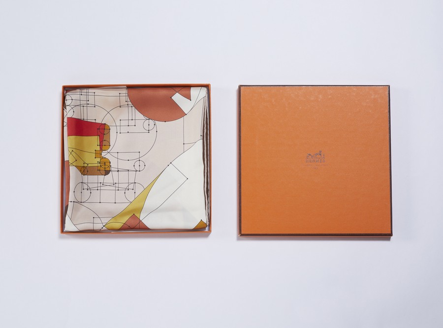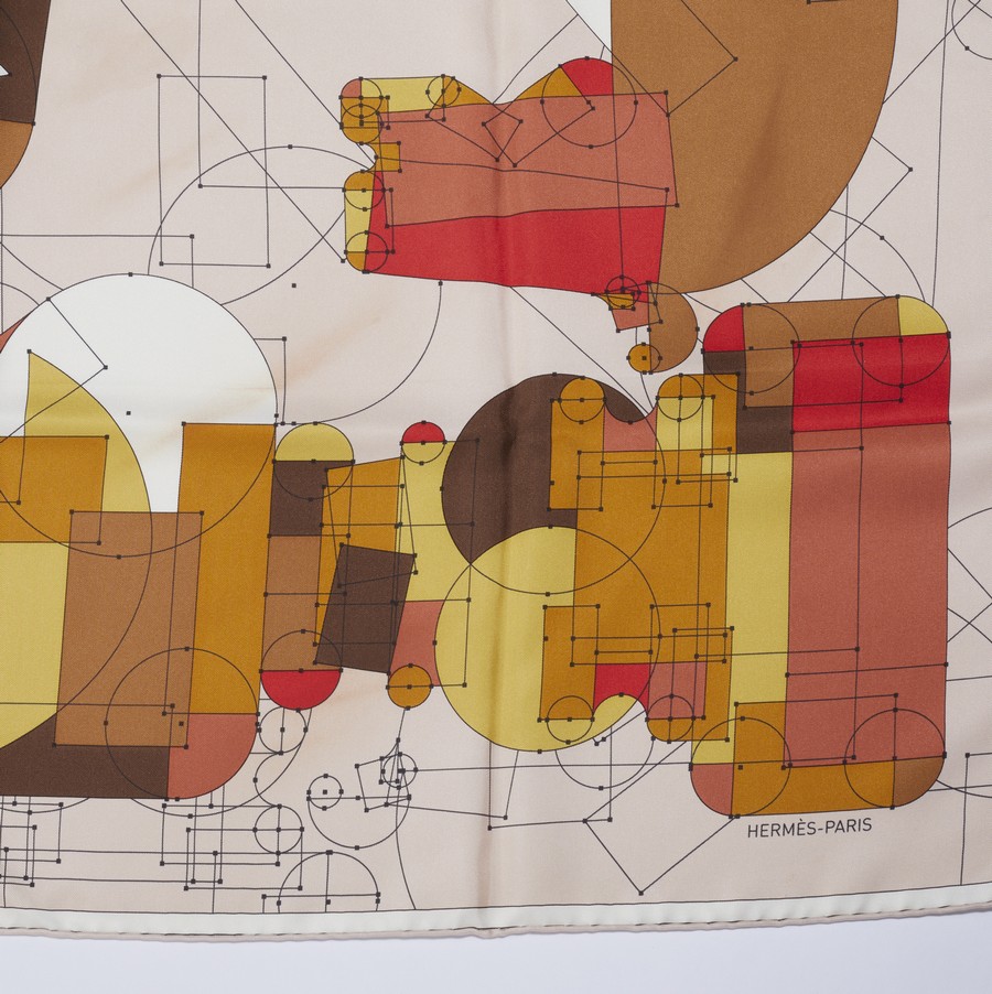 HERMES Foulard "Échec au roi". Seta. Cm 90,00 x 90,00. Motivi geometrici su fondo rosa. Annodato a mano. Disegnato da: Benoît Pierre Emery, stilista francese e direttore creativo di Objets et La Table di Hermès.