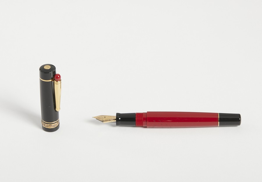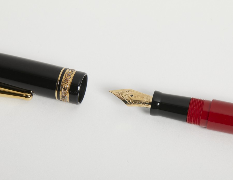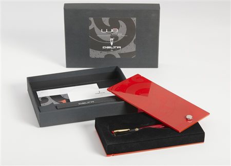 DELTA Penna stilografica. . . Penna rossa, cappuccio a vite, pennino in oro 14k, doppio sistema di caricamento a stantuffo, cartucce, cofanetto e libretto.