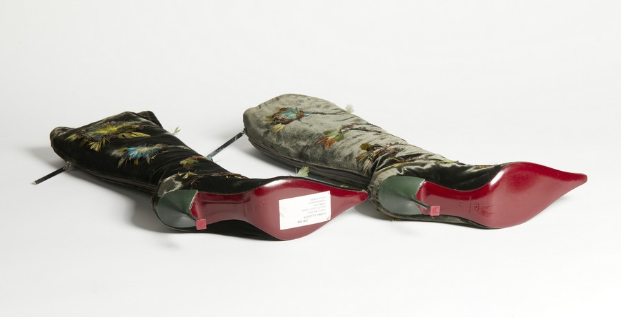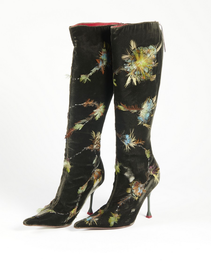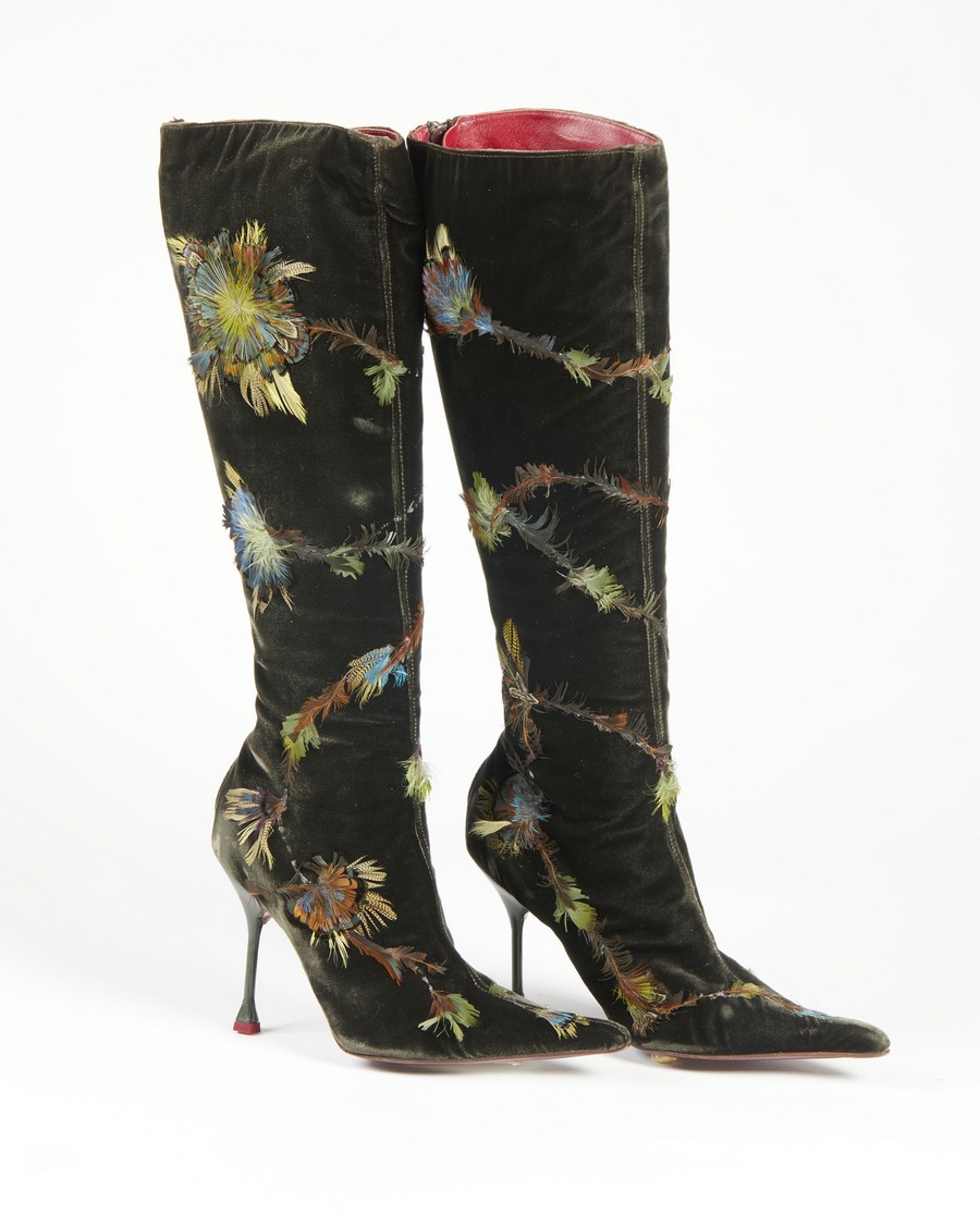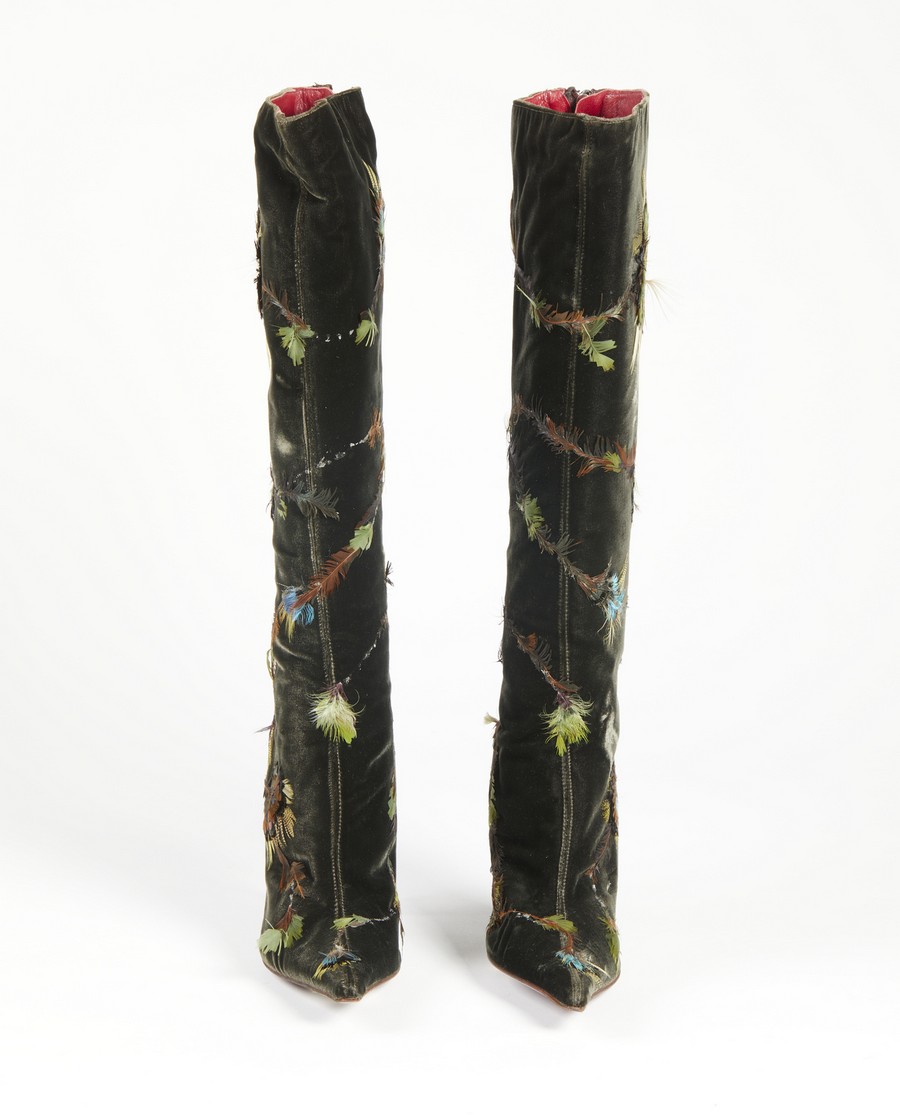 MERAZZI CLAUDIO Paio di stivali. . . Stivali in velluto a punta con tacco e piumaggi decorativi applicati.