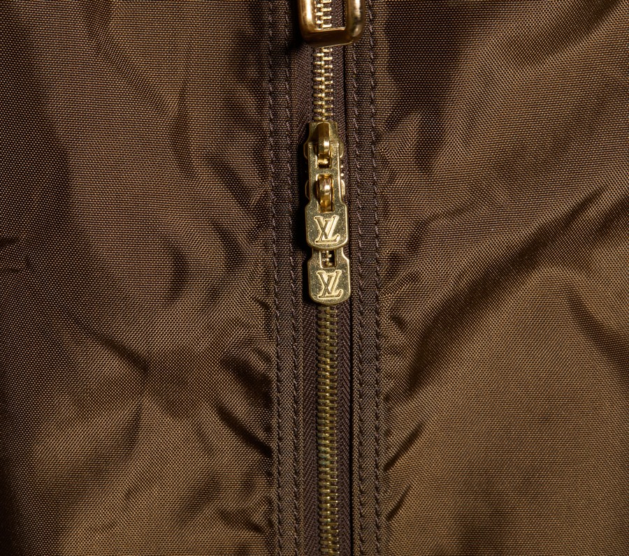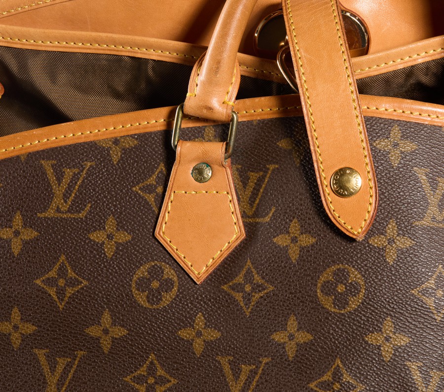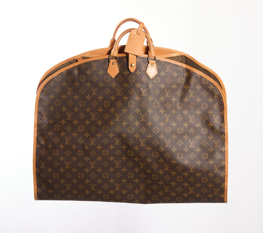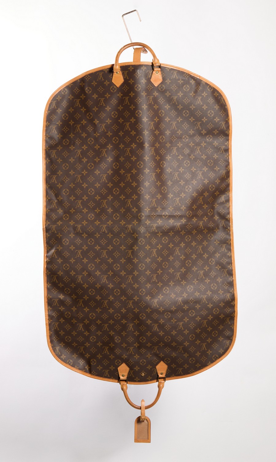 VUITTON LOUIS Porta abiti con gruccia. Tessuto.. Cm 62,00 x 103,00. Porta abiti in tessuto logo, con inserti in vacchetta, compreso di gancio gruccia.
