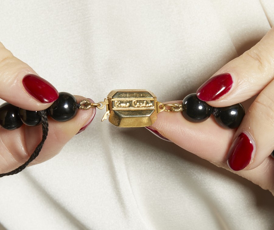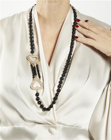 CARDIN PIERRE (1922 - 2020) Collana pendente. . . Collana pendente a perle sintetiche nere, cuori e cristalli.