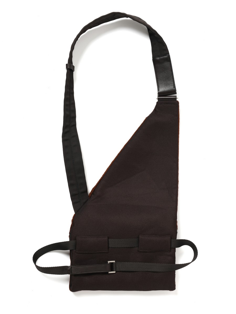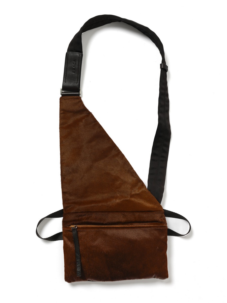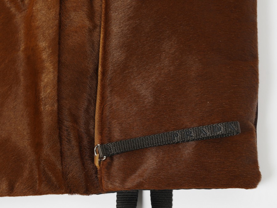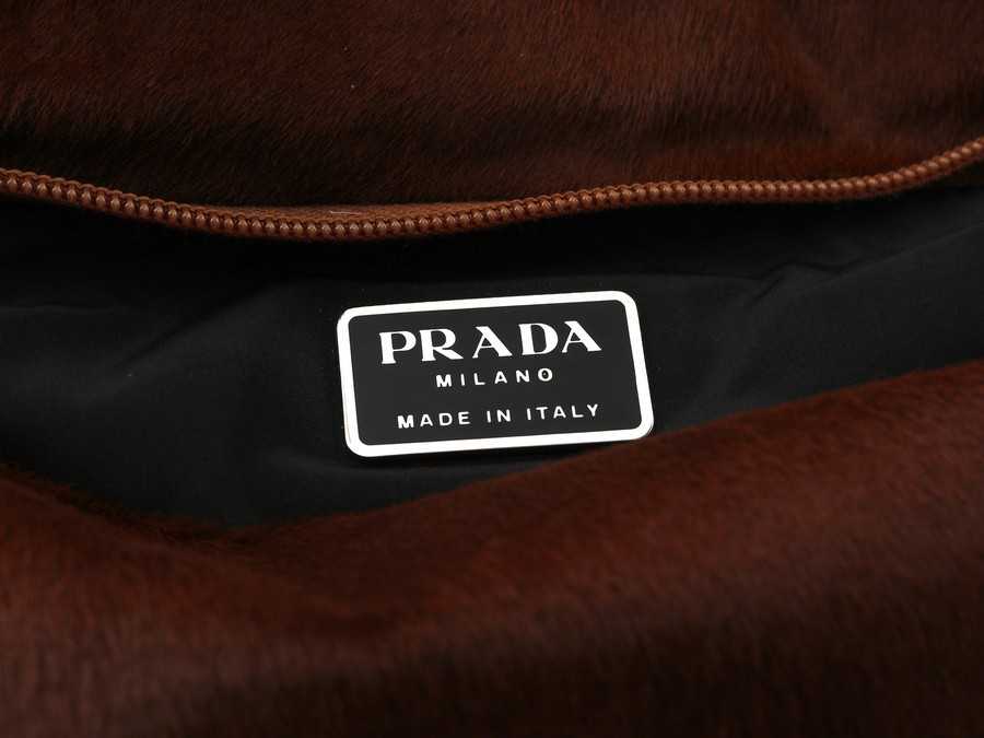 PRADA MILANO Borsa a tracolla. Pelle di cavallino.. Cm 26,00 x 12,00 x 3,00. Borsa a tracolla in cavallino naturale e tessuto imbottito marrone scuro.