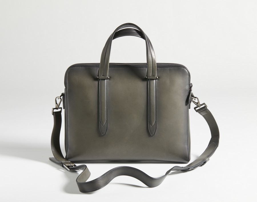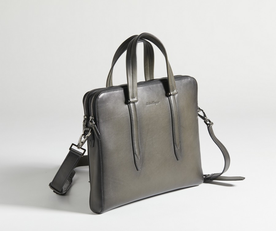 FERRAGAMO SALVATORE Borsa per computer nera fumè . Pelle. Cm 36,00 x 29,00 x 5,00. Borsa a tracolla portacomputer in pelle nera fumè con logo frontale, due aperture con zip e manici. Interni in tela monogram e tasche piatte. Hardware color argento.
