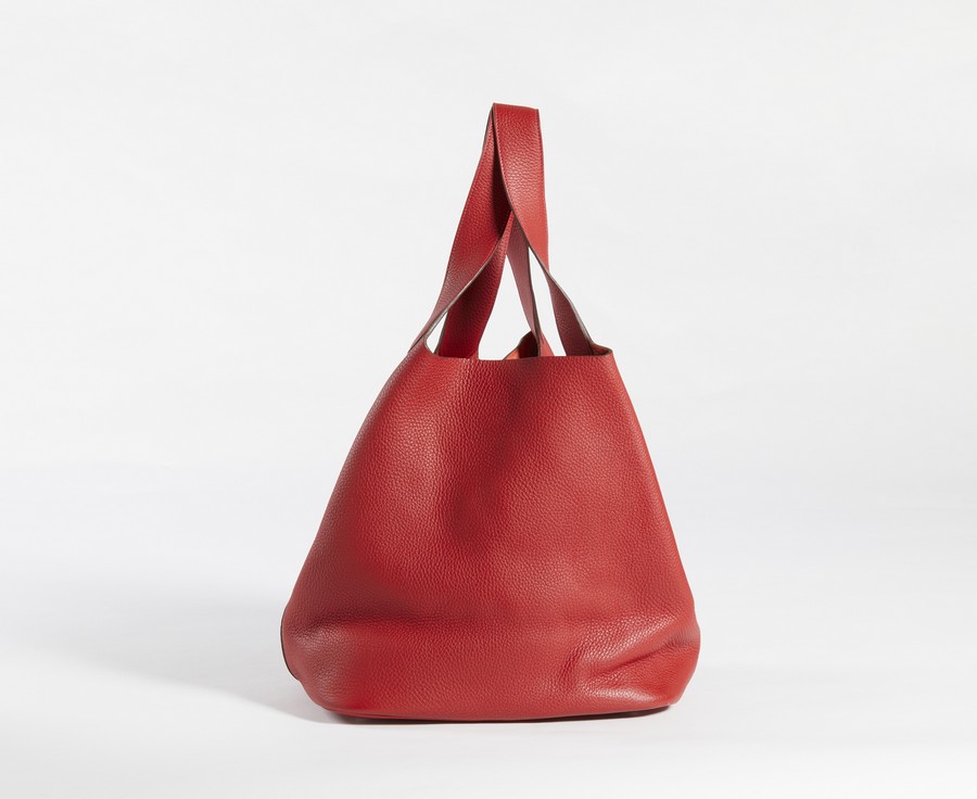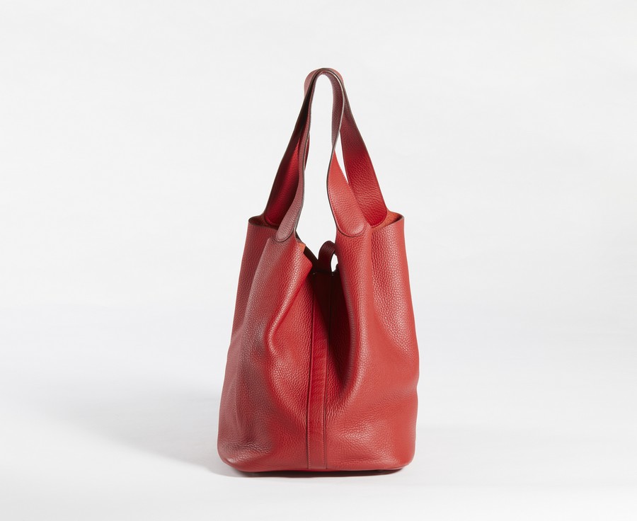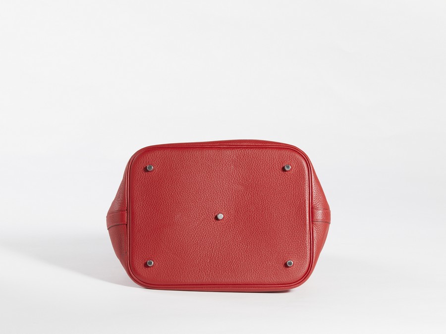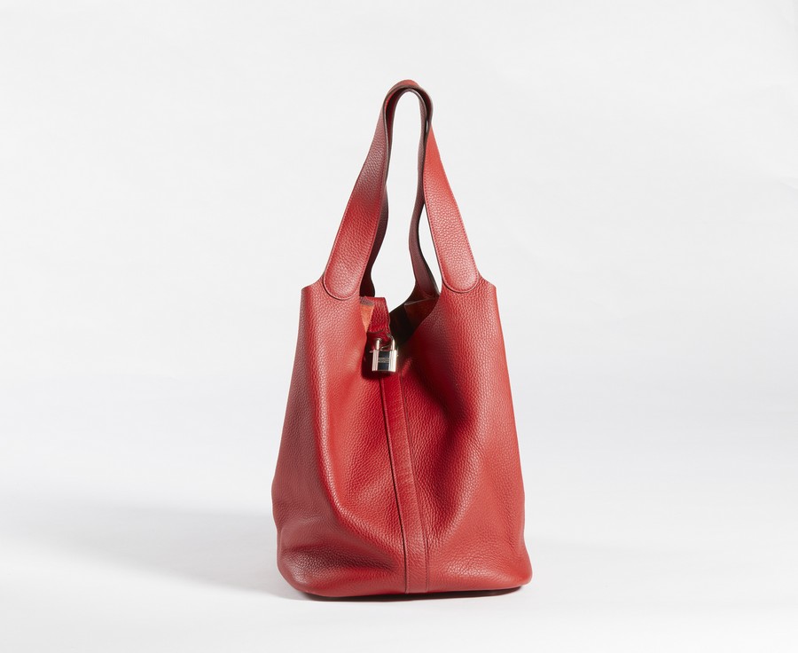 HERMES Borsa Picotin Lock 26 in pelle rossa. Pelle. Cm 31,00 x 50,00 x 26,00. Borsa Picotin Lock 26 in pelle rossa. Nessuna fodera, bordi a taglio vivo cucitura centrale e patta regolabile prezioso lucchetto a chiusura della borsa. No chiave.