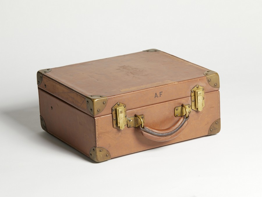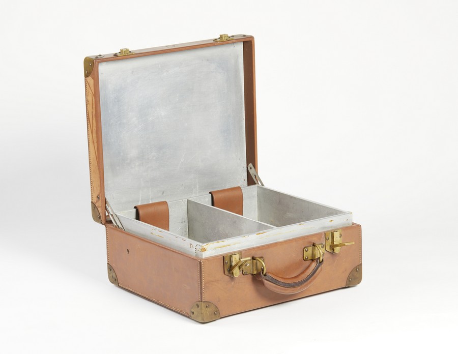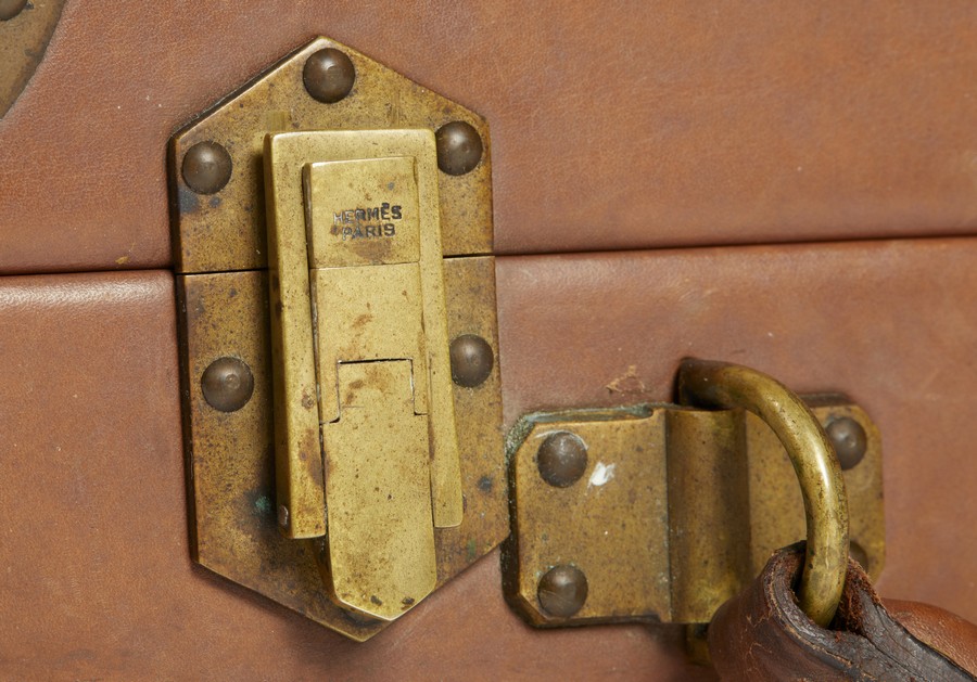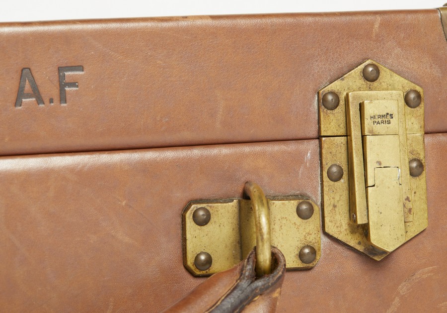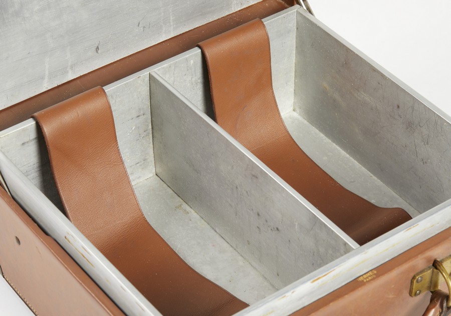 HERMES Bauletto. Metallo cromato e pelle.. Cm 31,50 x 27,50 x 14,50. Iniziali A.F. Intero in metallo.