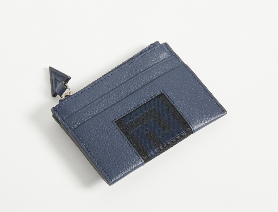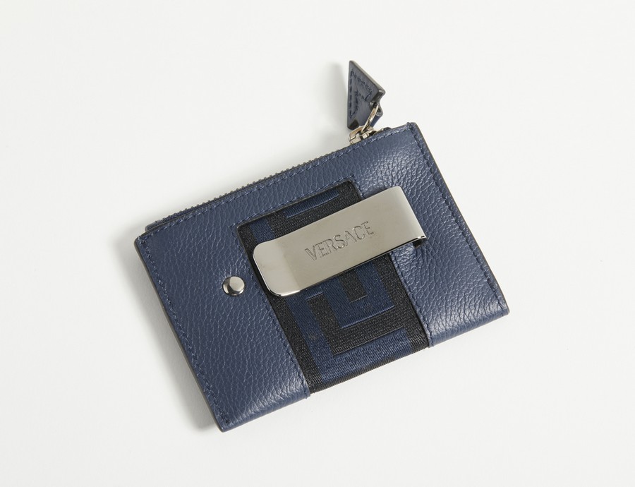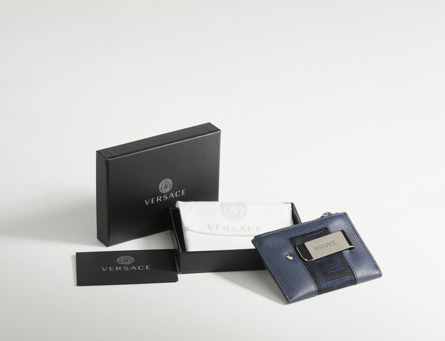VERSACE GIANNI (1946 - 1997) Portacarte con cerniera . Pelle. Cm 10,50 x 8,00. Portacarte in pelle blu con cerniera e molletta portasoldi logata.