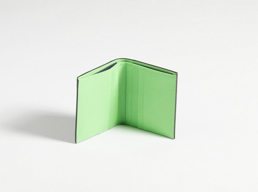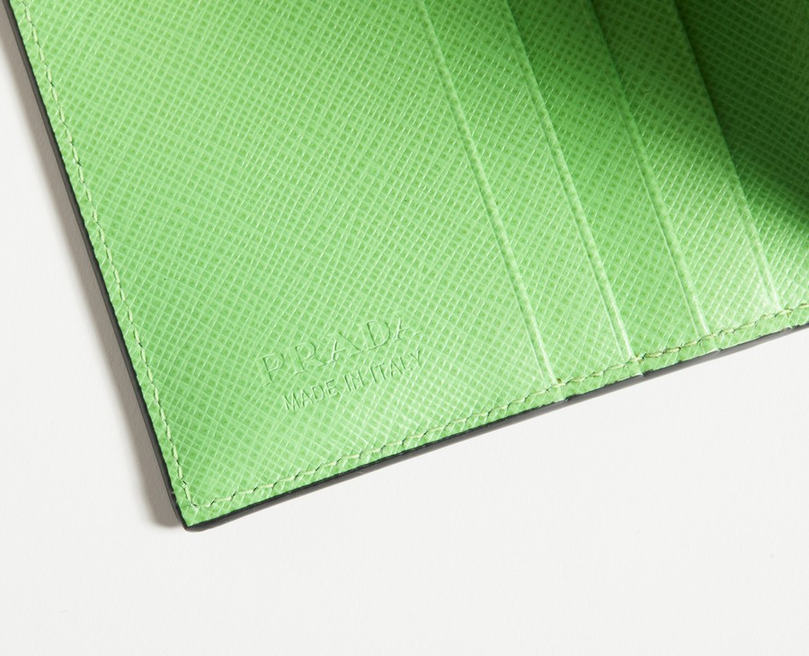 PRADA MILANO Portafoglio orizzontale nero e verde fluo . Pelle. Cm 9,00 x 10,00. Portafoglio orizzontale in pelle saffiano, colore nero e verde fluo, logo al fronte