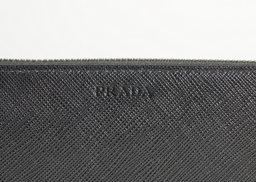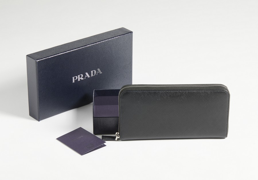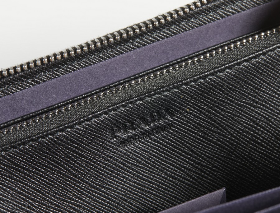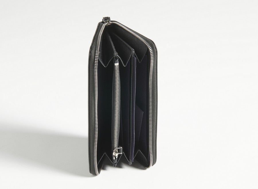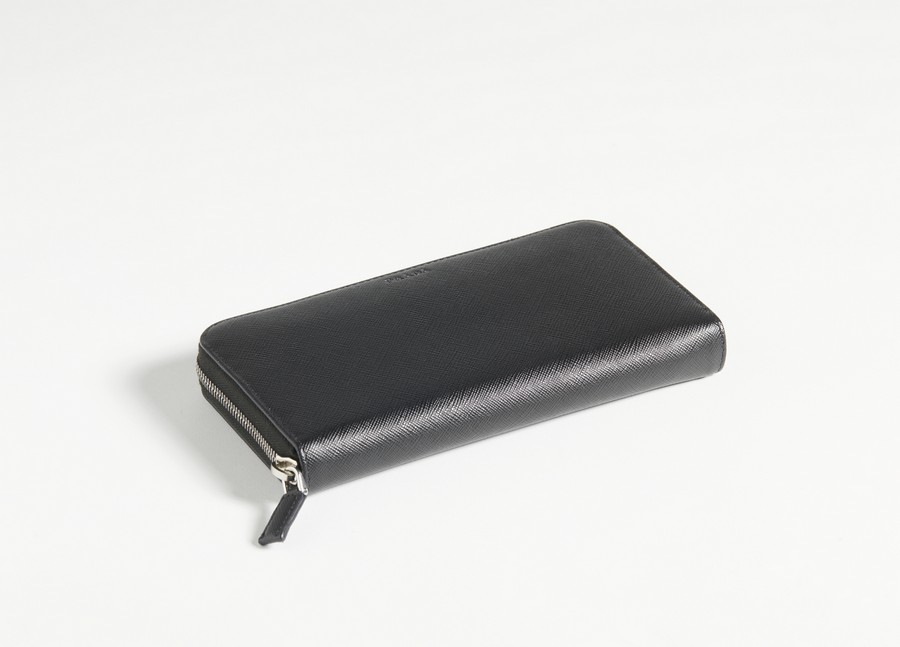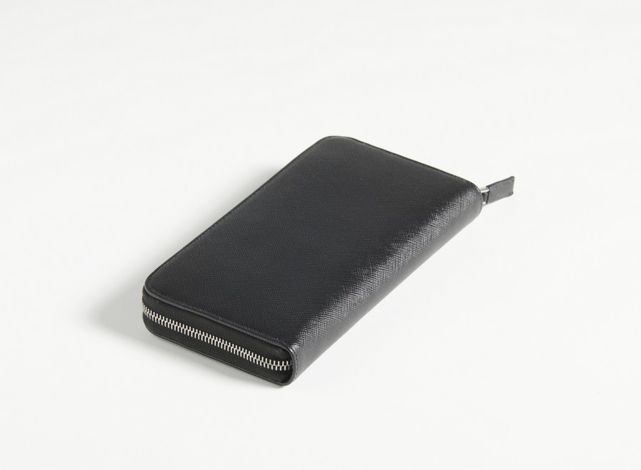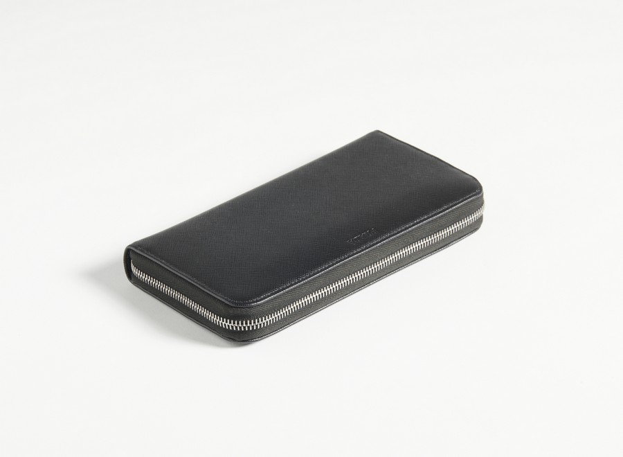 PRADA MILANO Portafoglio lampo nero. Pelle. Cm 20,00 x 11,00. Portafoglio in pelle Saffiano nero con cerniera, logo al fronte.