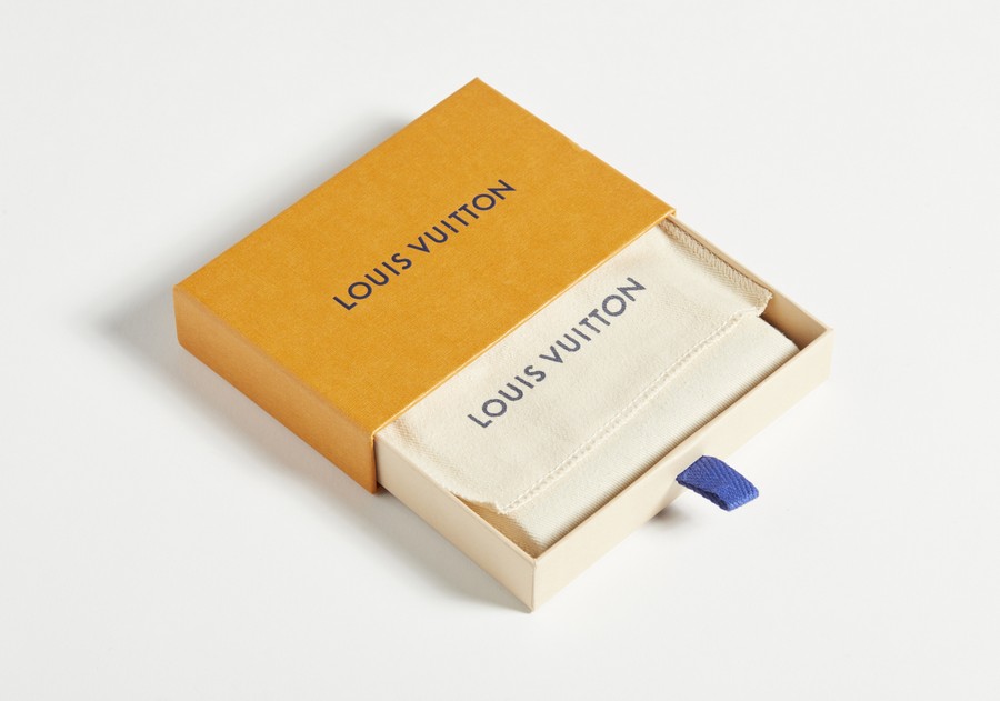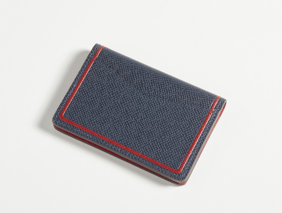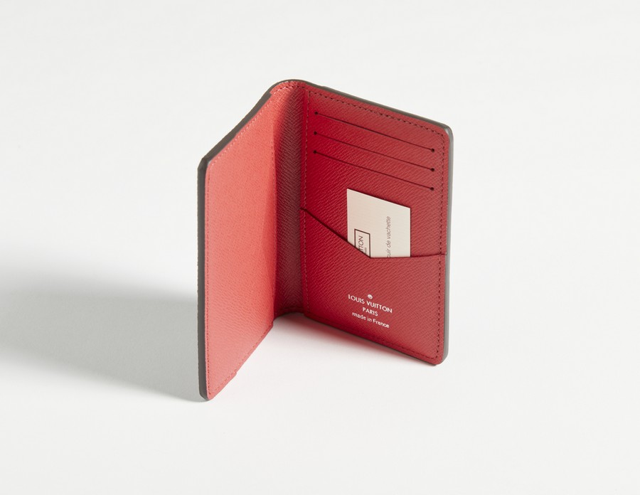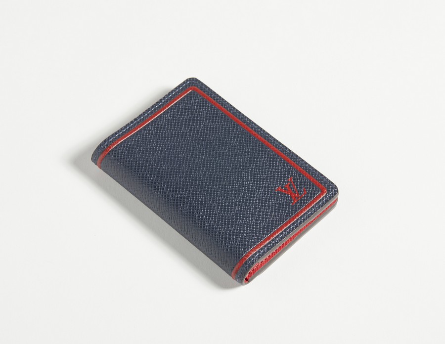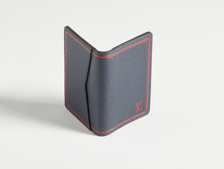 VUITTON LOUIS Portacarte bicolore. Pelle. Cm 8,00 x 11,50. Portacarte in pelle blu con interno e cordino rosso, logo al fronte. Con scatola originale.
