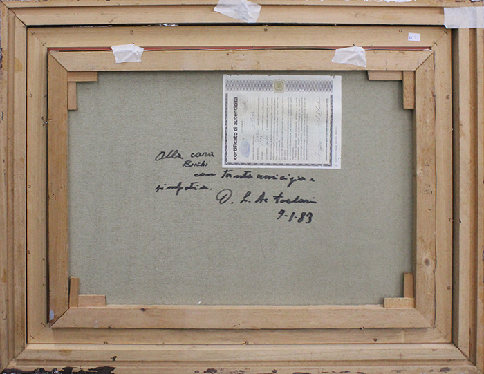 OSMAN LORENZO DESCOLARI, 1980, olio su tela, cm 50x70 con cornice in omaggio 68x88x4 kg 5 . Al fronte: firma in basso a sinistra. Al verso: dedica, firma, certificato di autenticità con la firma dell'artista. Certificato di provenienza della Daliano Ribani Arte. Opera con cornice in omaggio.