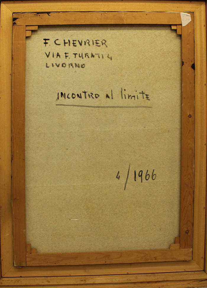 CHEVZIER FERDINAND 1966 "Incontro al limite" cm 100x70 con cornice 126x95x3,5 kg 10 Al fronte: firmato in basso a sinistra Al verso: firma e luogo di eseguzione titolo e anno. Certificato di provenienza della Daliano Ribani Arte. Opera con cornice in omaggio.